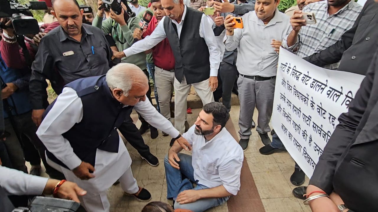 बुधवार को क्रॉस वोटिंग के खिलाफ कांग्रेस के ही दो विधायक अपनी ही पार्टी के खिलाफ धरने पर बैठ गए। चंडीगढ़ के सेक्टर-9 स्थित प्रदेश कांग्रेस मुख्यालय में सिरसा विधायक गोकुल सेतिया ने धरना दिया। धरने पर कुछ देर बाद ही नांगल-चौधरी विधायक मंजू चौधरी भी पहुंच गई। गोकुल सेतिया ने कहा कि कांग्रेस को उन विधायकों के नाम पब्लिक करने चाहिए, जिन्होंने पार्टी को धोखा दिया और क्रॉस वोटिंग की। उन्होंने उन विधायकों के नाम भी सार्वजनिक करने की मांग उठाई, जिनके वोट रद्द हुए हैं। धरने पर बैठे विधायकों को उठाने के लिए पूर्व सीएम व नेता प्रतिपक्ष भूपेंद्र सिंह हुड्डा कांग्रेस मुख्यालय पहुंचे। उन्होंने विधायकों को समझाया। इसी दौरान बीके हरिप्रसाद ने नई दिल्ली में प्रेस कांफ्रेंस करके चार विधायकों के नाम सार्वजनिक कर दिए। बाद में गोकुल सेतिया व मंजू चौधरी ने अपना धरना समाप्त कर दिया और वे विधानसभा पहुंचे। गोकुल सेतिया ने पार्टी के साथ गद्दारी करने वाले विधायकों को कांग्रेस से बाहर करने की मांग भी उठाई।