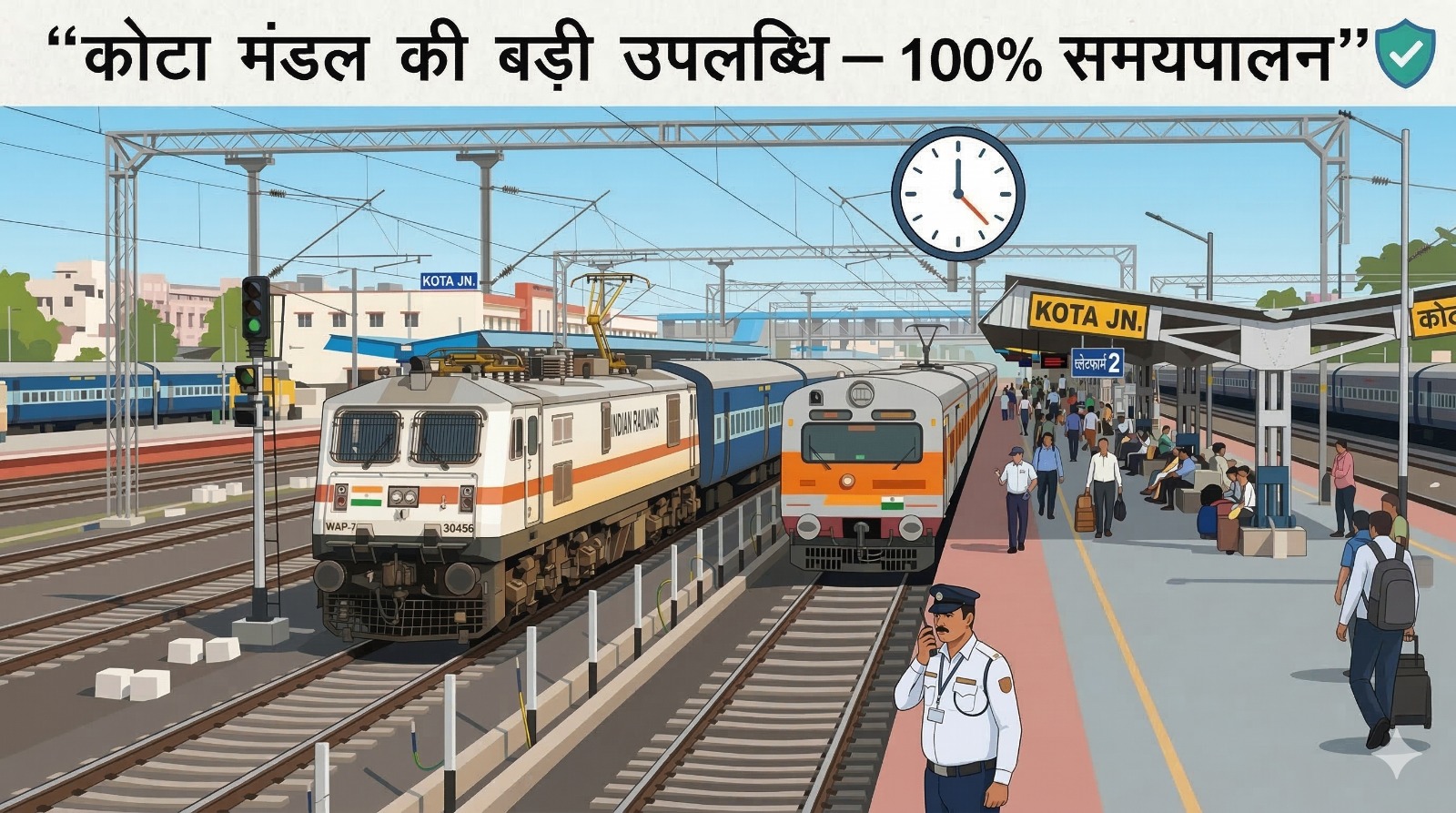 वरिष्ठ मंडल वाणिज्य प्रबंधक सौरभ जैन ने बताया कि चालू वित्तीय वर्ष में कोटा मंडल द्वारा 100 प्रतिशत समयपालन की उपलब्धि 20 अप्रैल, 13 जून, 12 जुलाई, 13 जुलाई, 10 अगस्त, 17 अगस्त 2025 तथा 7 मार्च और 12 मार्च 2026 को प्राप्त की गई है। उन्होंने बताया कि यह उपलब्धि परिचालन, यातायात रनिंग संचालन, गाड़ी एवं वैगन, संकेत एवं दूरसंचार, वाणिज्य तथा इंजीनियरिंग विभागों के समन्वित एवं सतत प्रयासों का परिणाम है।