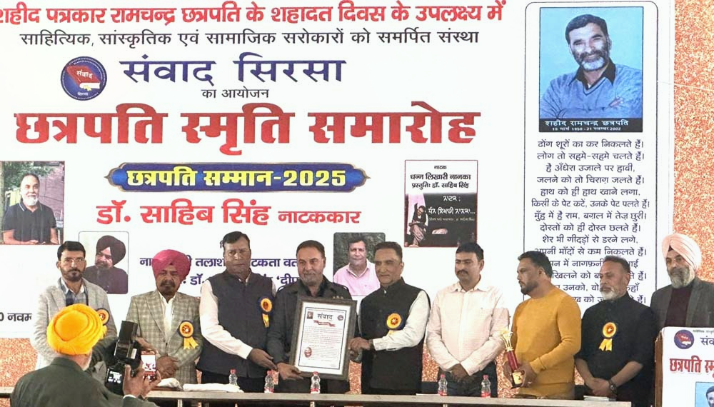रामचंद्र छत्रपति के व्यक्तित्व, कृतित्व एवं घटित इस पूरे प्रकरण से अवगत करवाते हुए अंशुल छत्रपति ने कहा कि छत्रपति आज भी जिंदा है तथा उनके विचार को आगे बढ़ाने के लिए ही यह कार्यक्रम किए जाते हैं तथा इन विचारों को समाज में लेकर जाने की जरूरत है। प्रो. हरभगवान चावला ने कहा कि यह नया भारत है और इस नए भारत में सारी पारंपरिक अवधारणाएं अर्थहीन हो रही हैं और डॉ. साहिब सिंह के नाटक इस नए भारत के सवालों के रूबरू करते हैं। कार्यक्रम में संवाद सिरसा के संयोजक परमानंद शास्त्री, डॉ. हरविंद्र सिंह प्रिंसिपल अरवेल सिंह, प्रिंसिपल बलदेव सिंह, हरजवंत सिंह, दर्शन सिंह भंगू, मास्टर वीर सिंह, राजकुमार शेखूपुरिया, डॉ. हरमीत कौर, शील कौशिक, गुरजीत सिंह मान, डॉ. मंगाराम पनिहारी, प्रो. वेदपाल आर्य, सोहन सिंह रंधावा, राजपाल सिंह, सुरेंद्रपाल सिंह साथी, डॉ. गुरप्रीत सिंह सिंधरा, प्रो. अशोक भाटिया आदि मौजूद रहे।
