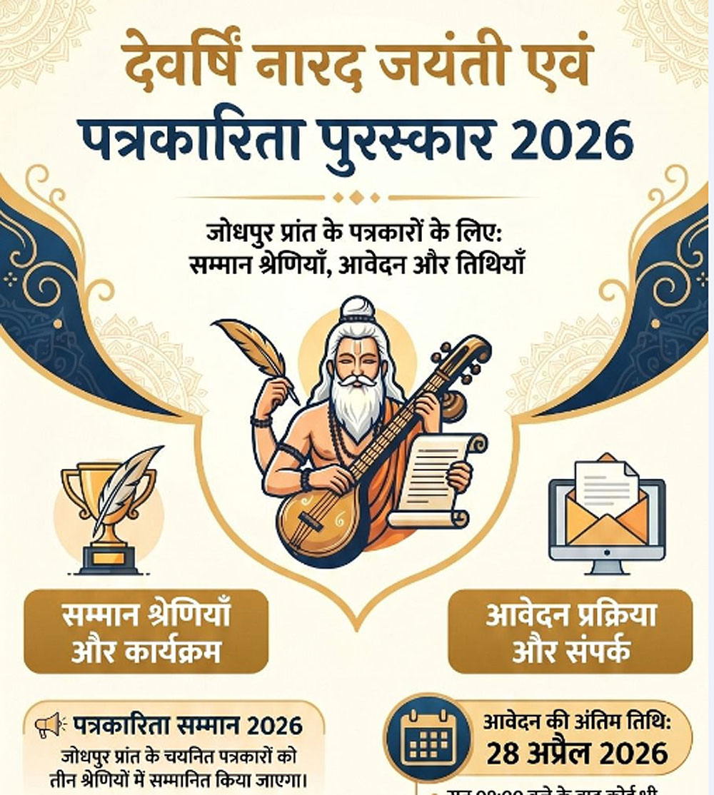 उन्हाेंने बताया कि देवर्षि नारद जयंती के उपलक्ष्य में विश्व संवाद केंद्र, जोधपुर द्वारा प्रतिवर्ष पत्रकारिता जगत की प्रतिभाओं को नारद विभूषण/भूषण/श्री उपाधि से अलंकृत किया जाता है। इस बार 2 मई काे यह कार्यक्रम हाेगा। गत एक वर्ष के अपने विशेष कार्यों का विवरण 28 अप्रैल 2026 तक नीचे दिए गए Google Form लिंक https://forms.gle/9bJsir2pCMTaE8mc6 पर भरकर प्रेषित करें।